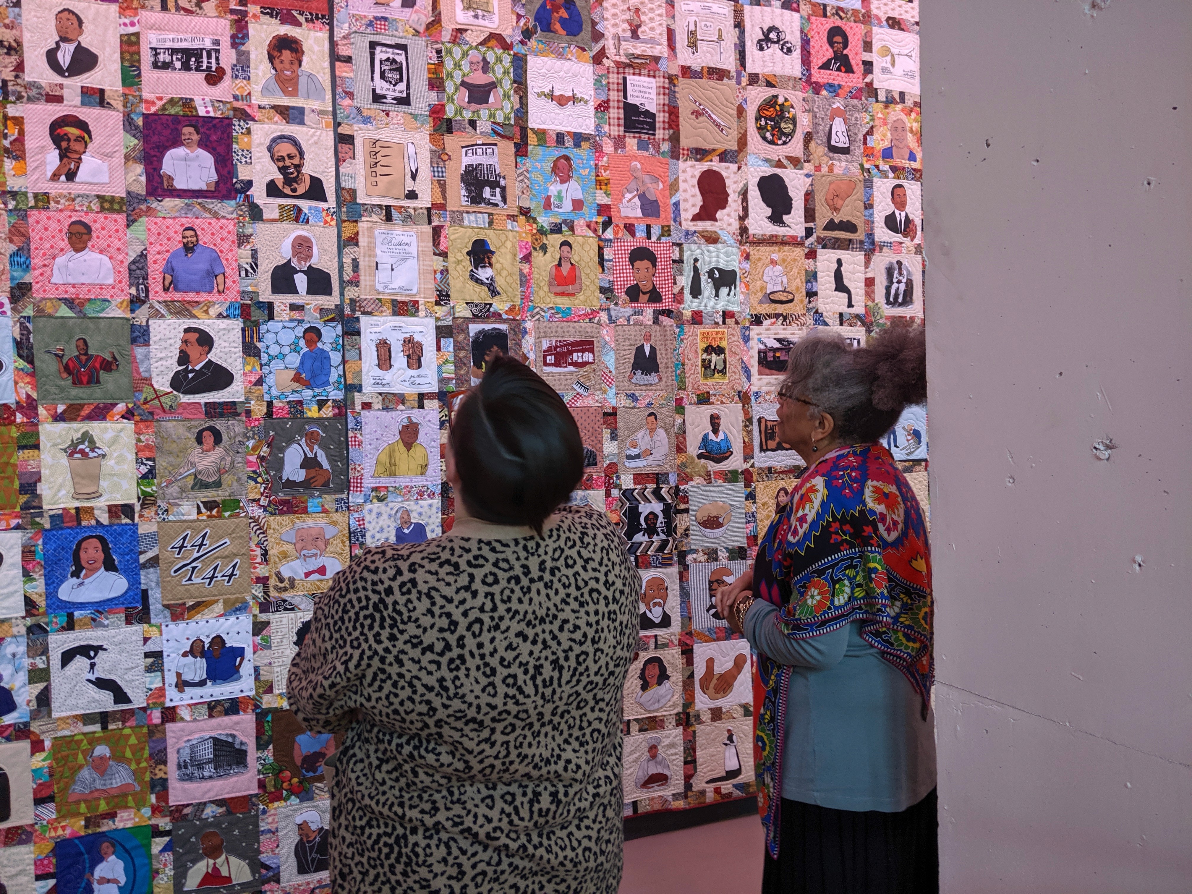 MOFAD Curatorial Director Catherine Piccoli viewing the Legacy Quilt with African/American lead Curator, Dr. Jessica B. Harris.
